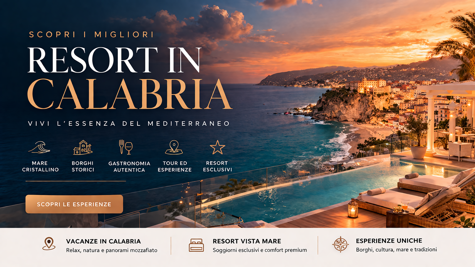 Promuoviamo con passione le principali destinazioni calabresi, tra cui Tropea, Scilla, Palmi, Pizzo, l'Aspromonte e Reggio Calabria. Offriamo anche esperienze uniche presso resort come il CapoSperone Resort a Palmi.